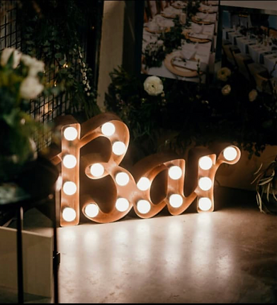 Z našich svietiacich nápisov ponúkame obľúbený spojený nápis Bar, ktorý spoľahlivo hostí nasmeruje na najdôležitejšie miesto svadby či večierku. Ponúkame ho v dvoch veľkostiach. Ďalej si u nás môžete prenajať svietiaci nápis Love. Nápis je veľmi obľúbeným doplnkom predovšetkým na svadby alebo zásnuby, kde vytvoria dokonalú romantickú náladu. Svetlo totiž vykúzli vždy tú správnu atmosféru. Ďalej ponúkame spojený nápis Coffee, ktorý máme v hrdzavej rustikálnej farbe.